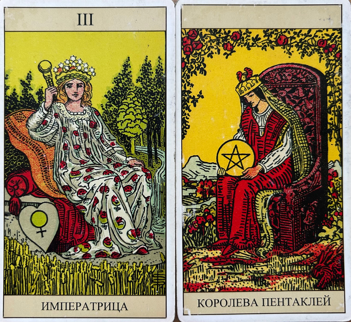 - И Императрица, и Королева Пентаклей — архетипы зрелой, ресурсной женщины, которая знает, как управляться с жизнью, детьми, деньгами и собой.