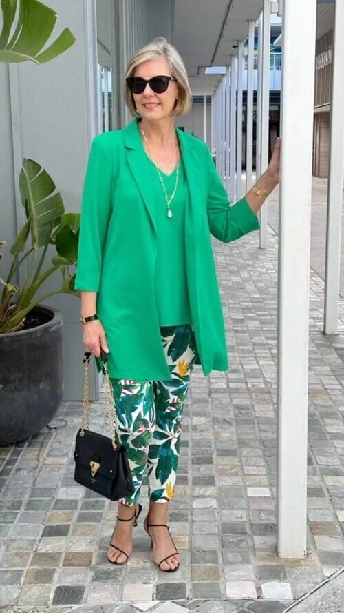 Зелёный — универсальный цвет, который освежает и молодит. Сочетайте однотонную зелёную блузку с тонким пиджаком и брюками с крупным цветочным принтом. Такой контраст добавляет динамики и подходит для любого случая — от прогулки до встречи с друзьями.