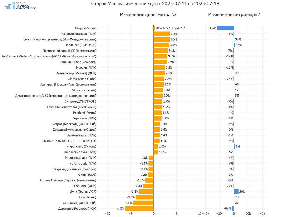 Старая Москва, обзор изменения предложения на рынке за неделю💰 Смотрим без премиум и элит классов. 💵 За 7 дней цена метра выросла на 0.3% до 439 100 рублей за метр. 📈Топ изменения цен (подорожало): 1️⃣ЖК "Матвеевский парк" (ПИК) цена метра +3.6%, витрина предложения уменьшилась на -645м2 2️⃣ЖК "1-я ул. Машиностроения, д. 5А" («Фонд реновации») цена метра +3.5%, объем витрины при этом увеличился на 200м2 3️⃣ЖК "HeadLiner" (КОРТРОС) цена метра +3.4%, объем витрины при этом увеличился на 1147м2 🪫Анти топ (подешевело): 1️⃣ЖК "Движение.Говорово" (ФСК) -6.2% в цене, витрина предложения уменьшилась на -3174м2 2️⃣ЖК "Событие" (ДОНСТРОЙ) цена метра -4.5%, без изменения объема предложения 3️⃣ЖК "Pave" (Forma) -3.9% в цене, объем витрины при этом увеличился на 71м2 ☄️Объем предложения жилья в регионе ниже -1.4% (-24179 м2) Все изменения в регионе на картинке, ставьте 🔥если хотите посмотреть на Новую Москву. 🔥 @pulsprodaj