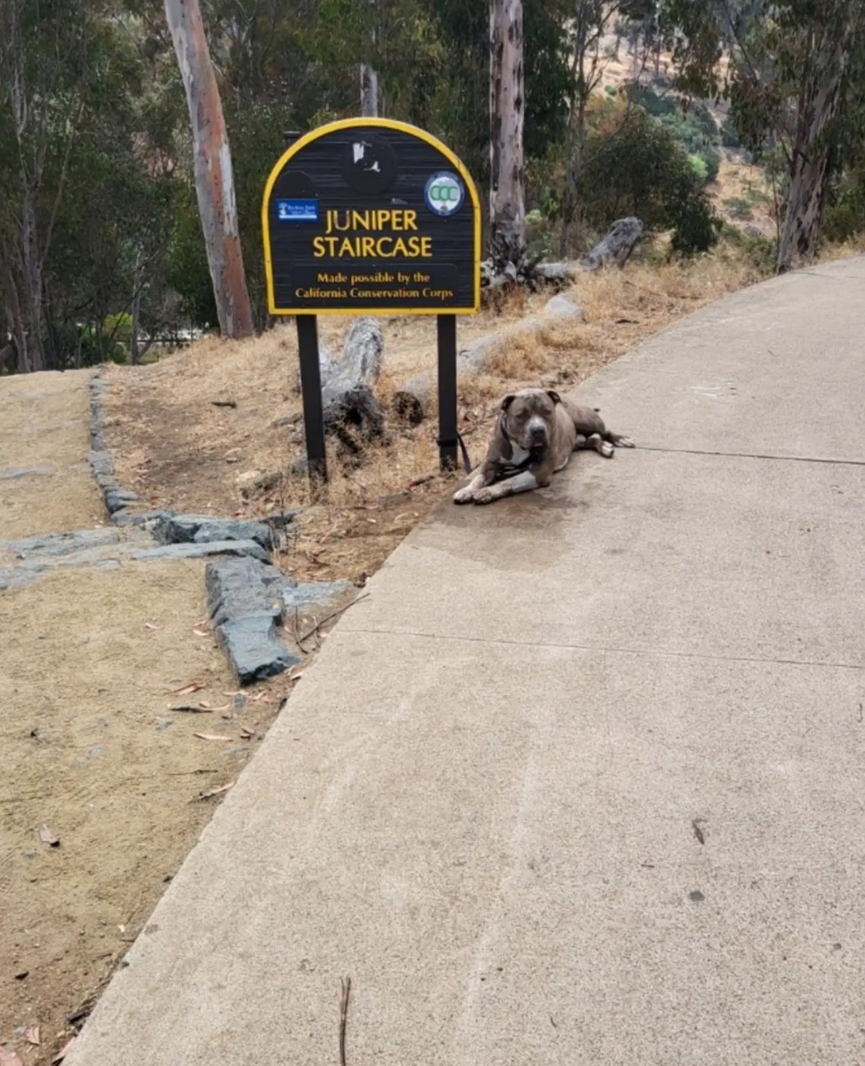 В американском штате Калифорния мужчина заметил питбуля, которого бросили в парке, привязав к указателю «Можжевеловая лестница». Он позвонил своей подруге-волонтеру Эрике, и та примчалась на помощь. Когда она подошла к собаке, то заметила, что тот, кто ее бросил, оставил записку: «Я его недавно забрал, но я переоценил свои возможности. Хороший пес, но не могу его оставить себе. А прежнему хозяину он не нужен. Пожалуйста, помогите». Питбуль смотрел на Эрику грустными глазами и вилял хвостиком. Она не могла оставить его одного и решила спасти несчастного. Эрика назвала пса Можжевельником. Можжевельник оказался очень дружелюбным и без проблем запрыгнул в машину. У самой женщины уже есть три собаки, поэтому ей пришлось временно отвезти Можжевельника в приют. Однако Эрика пообещала не оставлять его в беде, навещала его каждый день и приносила вкусняшки. По закону Можжевельник должен был провести некоторое время на карантине, получить полагающиеся прививки и пройти операцию кастрации. После