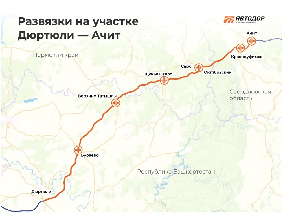 16 июля в Бураевском районе был дан старт движению автотранспорта на новом участке Дюртюли – Ачит автодороги М-12 «Восток». Это 275 км современной скоростная четырехполосная трасса с транспортными развязками и бесконтактной системой оплаты проезда. Новая трасса существенно повысит связанность Урала с Поволжьем, сократив время в пути легкового транспорта от Казани до Екатеринбурга более чем на шесть часов, а грузового — более чем на четыре часа. Это также позволит повысить безопасность движения и вывести грузовой трафик за пределы населенных пунктов. Отвечаем на главные вопросы об участке трассы М-12 «Восток» Дюртюли – Ачит.