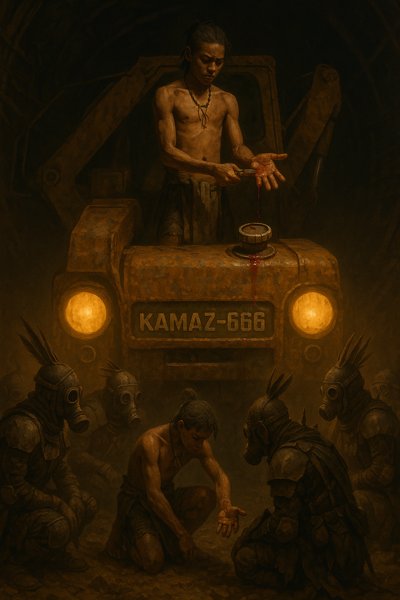 Жанр: Постапокалиптический миф + технотриллер «Капля крови упала на символ “КАМАЗ-666” — и “Бог” ожил. Гул двигателя разорвал тишину Песчаного Собора. “ТОПЛИВО: ТИП О-”, — проскрипели динамики. Я смотрел, как мой сын лезет на кабину с канистрой. Мы думали, “О” — это октан. Ошибка. В мануалах выживших буква значила только одно: organic. Органика. Человечина». Песчаные дюны погребли Москву на 98 метров. Мы, «Асфальтовые Коты», выжили в тоннелях метро. Наш Бог — экскаватор «КАМАЗ-666». Каждое полнолуние мы дарим ему кровь, чтобы получить координаты «Воды Неба». Сегодня очередь моего сына, Дэна. Он разрезал ладонь над датчиком топлива. Капли упали на ржавчину. Свет фар вспыхнул желтым.