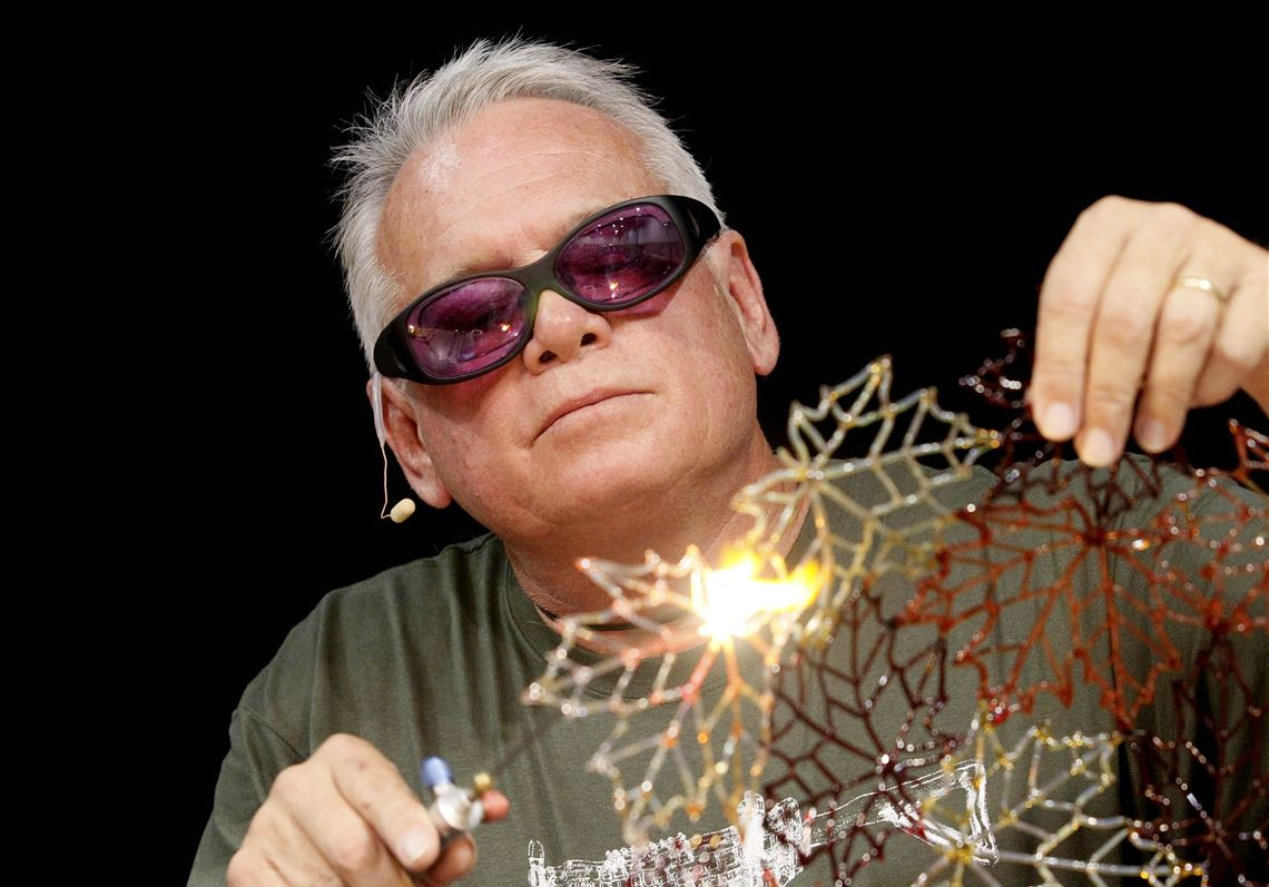 Сегодня Роберт Микельсен — культовая фигура в мире художественного стекла, но мало кто знает, что его нынешний успех стал возможен благодаря его первым шагам в технике флеймворк. Вернувшись к корням, он смог переосмыслить своё мастерство и заново открыть себя — уже в сфере функционального стекла, завоевав совершенно новую аудиторию и пережив самый яркий этап своей карьеры. Микельсен родился в 1951 году в Форт-Бельвуар, штат Вирджиния, но вырос на Гавайях, в Гонолулу. В середине 1970-х он два года обучался у профессионального стеклодува, а затем целое десятилетие продавал свои авторские изделия на ремесленных ярмарках под открытым небом. Переломным моментом стала встреча с легендарным Полом Стэнкардом в 1987 году — мастер-класс полностью изменил взгляд Роберта на возможности стекла. Уже через пару лет, в 1989 году, он окончательно уходит с ярмарок и начинает выставляться в галереях, участвует в престижных выставках по всей стране. Его работы попадают в крупнейшие собрания: в Ренвикскую