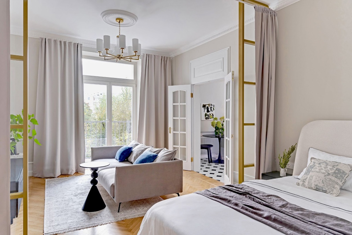 Гостиная и спальня в квартире — одно помещение. Место для сна условно зонировано стеклянными перегородками и портьерами с блэкаутом. Когда приходят гости, можно задвинуть шторы, скрыв спальню и разделив помещение на две части. В центре гостиной стоит диван с невысокой спинкой — вокруг него можно комфортно передвигаться.