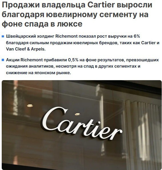 💍 Швейцарский холдинг Richemont #CFR сообщил о росте выручки на 6% в прошедшем квартале, несмотря на спад в индустрии люкса. Сильные продажи ювелирных брендов Cartier и Van Cleef & Arpels позволили компании превзойти ожидания аналитиков и компенсировать снижение в сегментах часов, моды и аксессуаров. Ювелирные бренды — Cartier и Van Cleef & Arpels — увеличили продажи третий квартал подряд, поскольку состоятельные покупатели сохраняют интерес к товарам высокого класса, несмотря на геополитическую неопределенность, пишет FT. Рост продаж ювелирных изделий, на долю которых, согласно отчету группы, приходится более 2/3 выручки компании, компенсировал спад в других подразделениях Richemont. Так, его ювелирные дома сообщили о росте продаж на 11% до 3,9 млрд евро с учетом постоянных валютных курсов за квартал, завершившийся 30 июня. Результат превысил консенсус- прогнозы аналитиков, собранные компанией Visible Alpha. Общая выручка группы выросла на 6% (без учета валютных колебаний) во второ