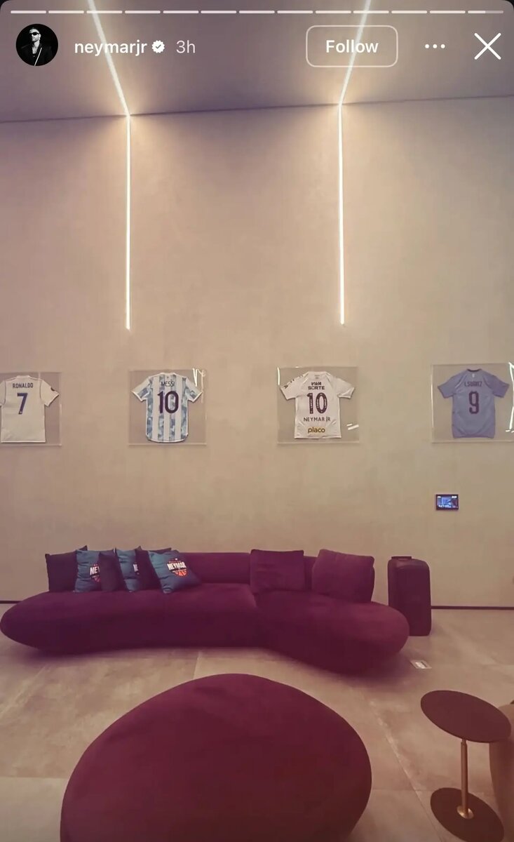 Неймар показал личную футбольную галерею — на стене у него висят футболки Криштиану Роналду, Лионеля Месси и его самого. Рядом — неожиданное дополнение: футболка Луиса Суареса. Майки аккуратно оформлены в рамы — видно, что для него это важные футболисты. Особенно трогательно, что там есть Суарес: с ним у Неймара была настоящая химия на поле в «Барсе», да и вне его они дружили крепко. Несмотря на статус Месси, именно связка Неймара и Суареса добавляла атаке клуба непредсказуемость и азарт. В 2015-м они взяли требл, а их взаимодействие на поле было почти телепатическим. Сейчас они давно разъехались по разным лигам, но уважение и память о лучших годах никуда не делись.