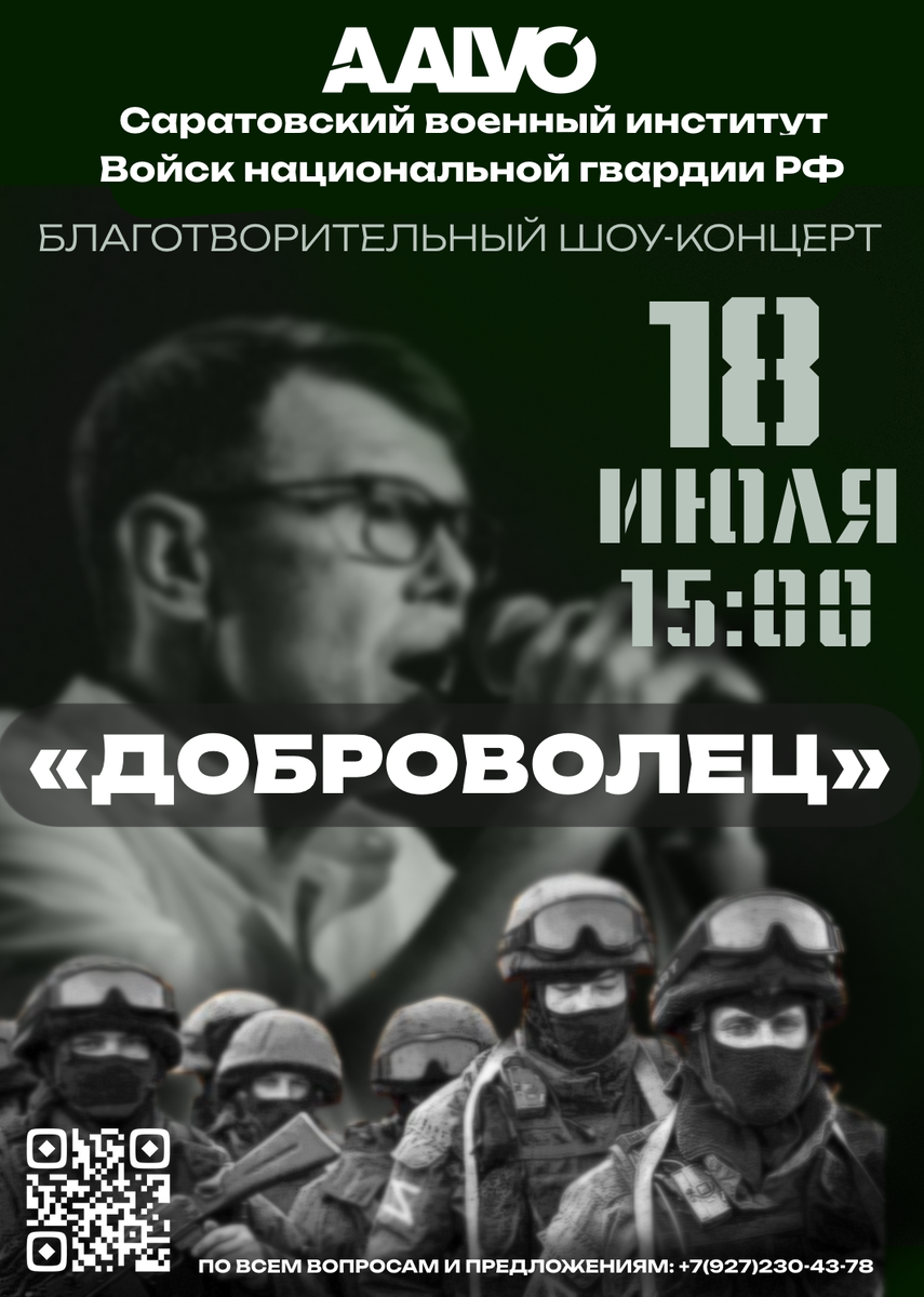 Саратовский военный институт войск Национальной гвардии РФ | 18 июля | 15:00 На сцене — Халитов Альфир с авторской песней «Доброволец». Это не просто выступление. Это — голос поколения, выбор сердца и настоящий музыкальный манифест тех, кто не остался в стороне. Приходи. Поддержи. Почувствуй. 🎶 Добровольцем может быть каждый — важно сделать шаг. 📞 По вопросам и предложениям: +7 (927) 230-43-78 📲 Сканируй QR-код на афише и будь в курсе всех подробностей.