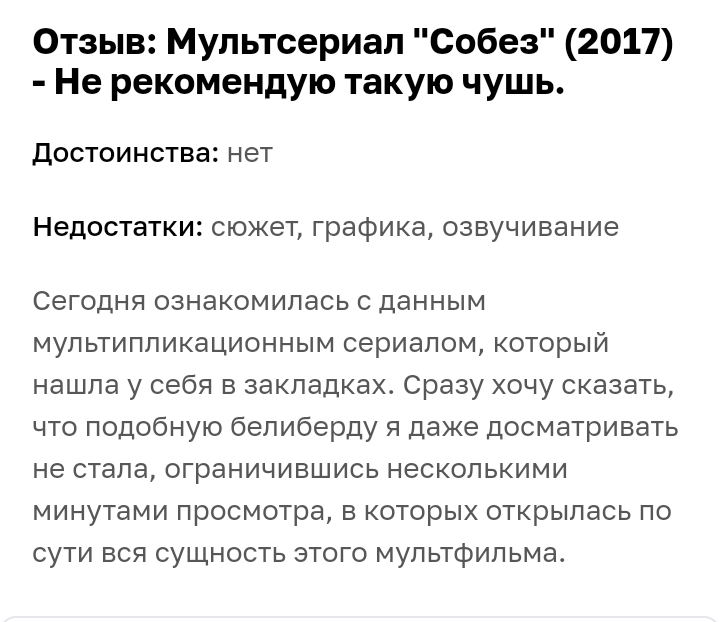 Всем привет, сегодня у нас спустя долгое время опять разбор претензий и сегодня мы будем разбирать негативный отзыв о мультфильме "Собез" некого пользователя "Отзовика" под ником "Venera87". Про графическое изображение хочу сказать, что это чисто вкусовщина рецензента, она конечно в этом мульте на любителя, но лично мне графика вполне понравилась, она очень красочная. А про второй абзац я хочу сказать, что нет ничего плохого в том, что в сериале используется обычная разговорная речь - не маты же. Что самое интересное эту же претензию можно предьявить и к советскому "Простоквашино". Там была подобная речь: "Шарик, ты балбес", "Фиг вам называется". На это все, до скорого