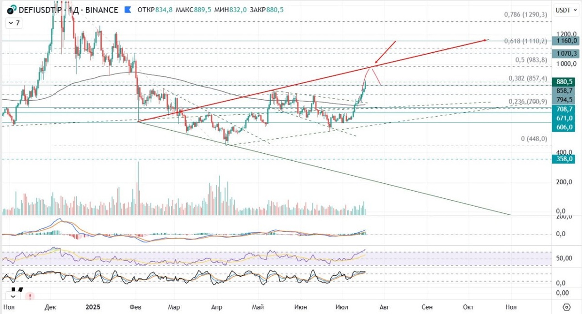 Перспективы роста по альте и запас текущего движения вверх. #DEFI - есть запас на рост до верхнего тренда - 1 скрин. 2 скрин - также, глобально можно разглядеть кривенькое ДД, если цена на коррекции сможет удержаться выше 850, то есть перспективы продолжить рост по альте - но тут нужно дождаться - только время покажет, как пойдет отработка в реальности. #TOTAL3 - полностью отработал намеченную ранее высоту до основного тренда. 3 скрин - если рассматривать внутренний флажок, то по полной высоте флагштока еще есть небольшой запас пойти выше - там же цену встретит уровень прошлого исторического максимума и направляющая по максиммумам. А вот сможет ли цена пробиться выше - тут уже вопрос, будем смотреть по факту - 4 скрин.