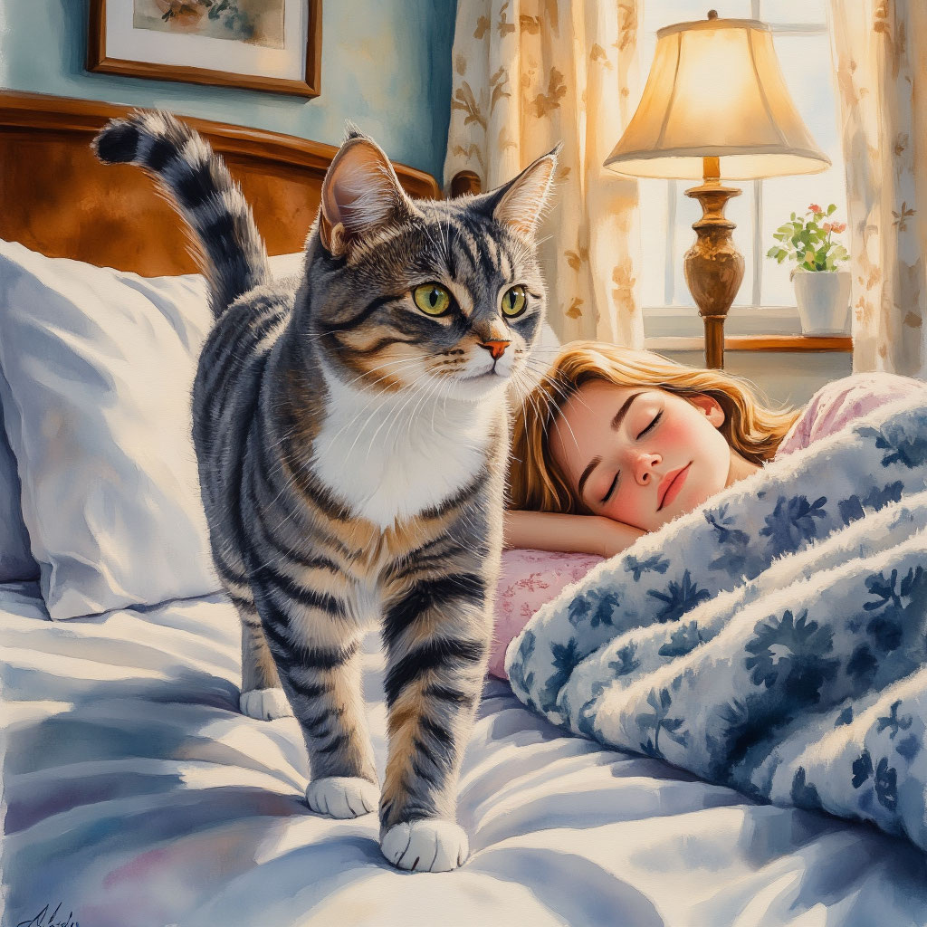 15.07.2025, 4:45. Сегодня решил проявить инициативу и разбудить хозяйку ещё до прихода Гоши. План был прост: 1) Мяукнуть у двери спальни, даже с учетом того что она была открыта. 2) Потоптаться по кровати. 3) Своим царским лицом потереться об её лицо (самый действенный метод).