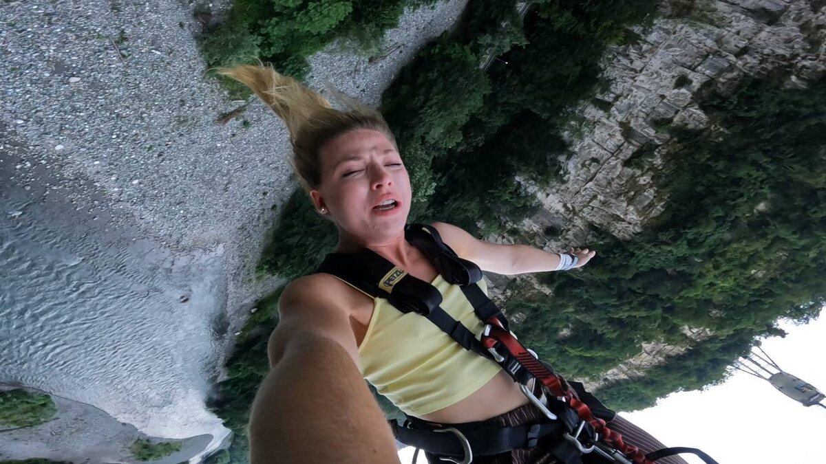 Перед прыжком с высоты популярная волгоградка успела исполнить эффектное сальто. А во время прыжка лицо блогера превратилось в безэмоциональную маску. Покров интуитивно закрыла глаза. Когда поняла, что ей ничего не угрожает, испытала в полете дикий восторг. Девушка в итоге зависла на длинной веревке с пешеходного моста над речкой: