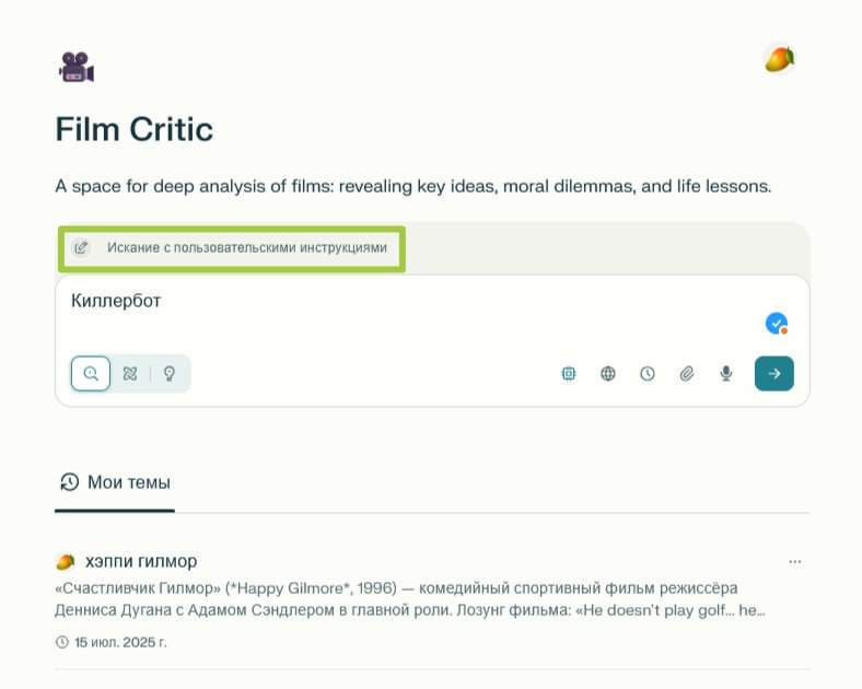 Смотрим кино с Perplexity и Notion Думаете, что просмотр фильмов — это прокрастинация? На самом деле, качественный просмотр — мощный инструмент развития личности.🍿 Исследования показывают, что кино активирует те же нейронные сети, что и реальный опыт, мы «проживаем» тысячи жизней и ситуаций, не выходя из дома. Чтобы глубже его осмысливать, использую Тематические Пространства — Spaces, в Perplexity. Они группируют все связанные диалоги и материалы в одном месте. Если хотите, чтобы рассказал о них подробнее, ставьте ❤️ 🎥 Назвал пространство Film Critic и прописал пользовательскую инструкцию — prompt: Когда пишу название фильма, сообщи основную информацию о нем: краткое содержание, режиссер, слоган. Затем проанализируй его смысл и основную идею. Объясни затронутые темы, как они соотносятся с реальной жизнью и чему могут научить. Какой урок необходимо усвоить, чтобы применить полученные знания в практической жизни? Включите краткий анализ символики, если таковой имеется. Раскрой