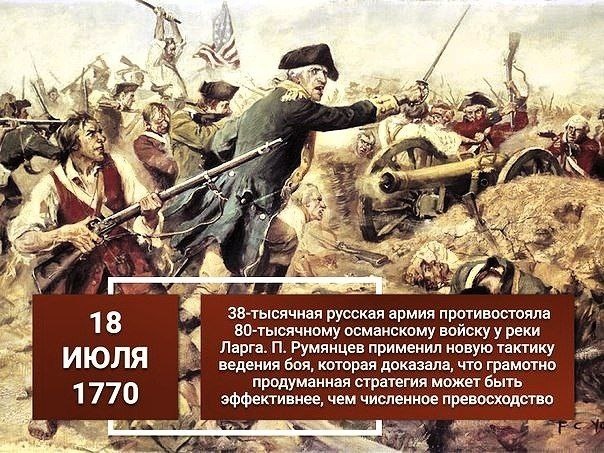 18 июля 1770 года русская армия под командованием П. А. Румянцева одержала победу при Ларге над превосходившей её по численности более чем в два раза турецкой армией. Битва состоялась у реки Ларга (ныне — Молдавия, близ границы с Румынией). Русские войска (38 000 солдат при 115 орудиях) разбили османское войско (80 000 человек) под предводительством Каплан-Гирея. Румянцев использовал новую тактику передвижения войск колоннами, которые в бою обращались в рассыпной строй, что препятствовало точному попаданию. Против конницы Румянцевым использовались пушки. Битва обернулась стратегической победой для России: были захвачены 33 турецких орудия и обширный вражеский лагерь. За этот успех Румянцев был награжден орденом Святого Георгия 1 степени.