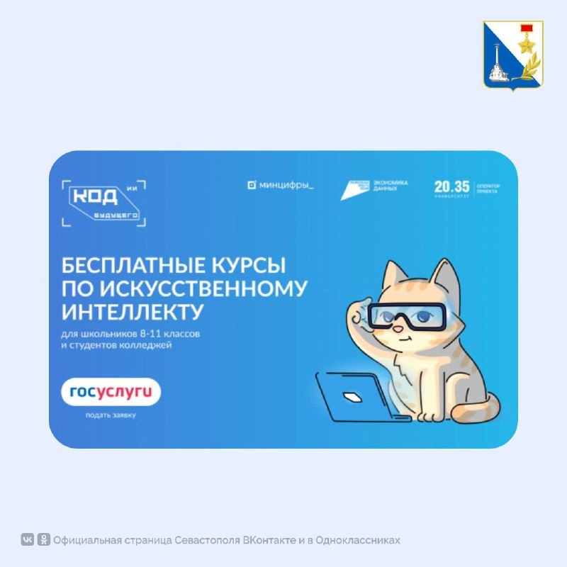 «Код будущего. Искусственный интеллект» 🍂Минцифры России запускает проект «Код будущего. Искусственный интеллект» для школьников 8–11 классов и студентов колледжей. С этого года можно бесплатно освоить современные технологии ИИ — от основ машинного обучения до создания собственных чат-ботов на Python. Обучение проходит онлайн, и к концу этого года более 75 тысяч человек уже получат ценные цифровые навыки. Подавай заявку на Госуслугах и открой для себя мир искусственного интеллекта. Правительство Севастополя