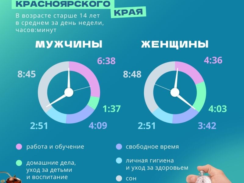 В крае мужчины отдыхают больше женщин и втрое меньше тратят времени на воспитание детей Участниками опроса стали жители края, возраст которых превысил 14 лет. Забегая вперёд, можно резюмировать: мужчины больше времени тратят на работу, а женщины — на домашние дела. Другими словами, свободных часов у сильной половины человечества куда больше, чем у женщин. По данным аналитиков, спят мужчины 8 часов 45 минут, женщины же спят на три минуты больше. На личную гигиену и уход за здоровьем и мужчины, и женщины тратят одинаково - по 2 часа 51 минуту. Что касается работы и обучения, то тут мужчины заняты гораздо больше: у них на это уходит 6 часов 38 минут, женщины же работают 4 часа 36 минут. На домашние дела, уход за детьми и воспитание женщины тратят 4 часа 3 минуты, у мужчин несколько легче в этом аспекте - на это у них уходит всего 1 час 37 минут. Согласно результатам проведённого опроса, на отдых у мужчин времени несколько больше и оно составляет 4 часа 9 минут, женщины же отдыхают 3