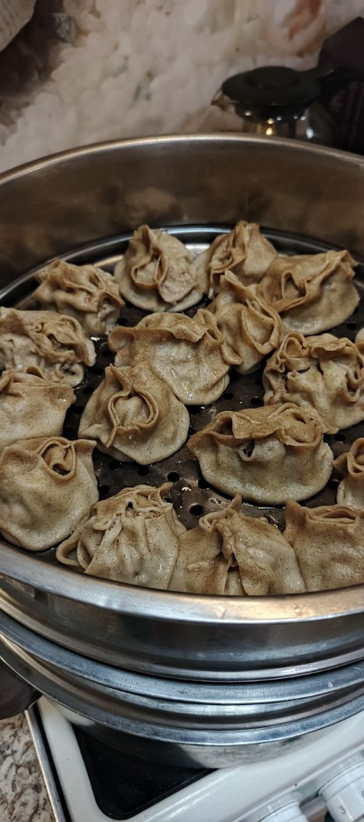 Это манты из цельнозерновой муки. Да, выглядят непривычно, но на вкус вообще никак не влияет.