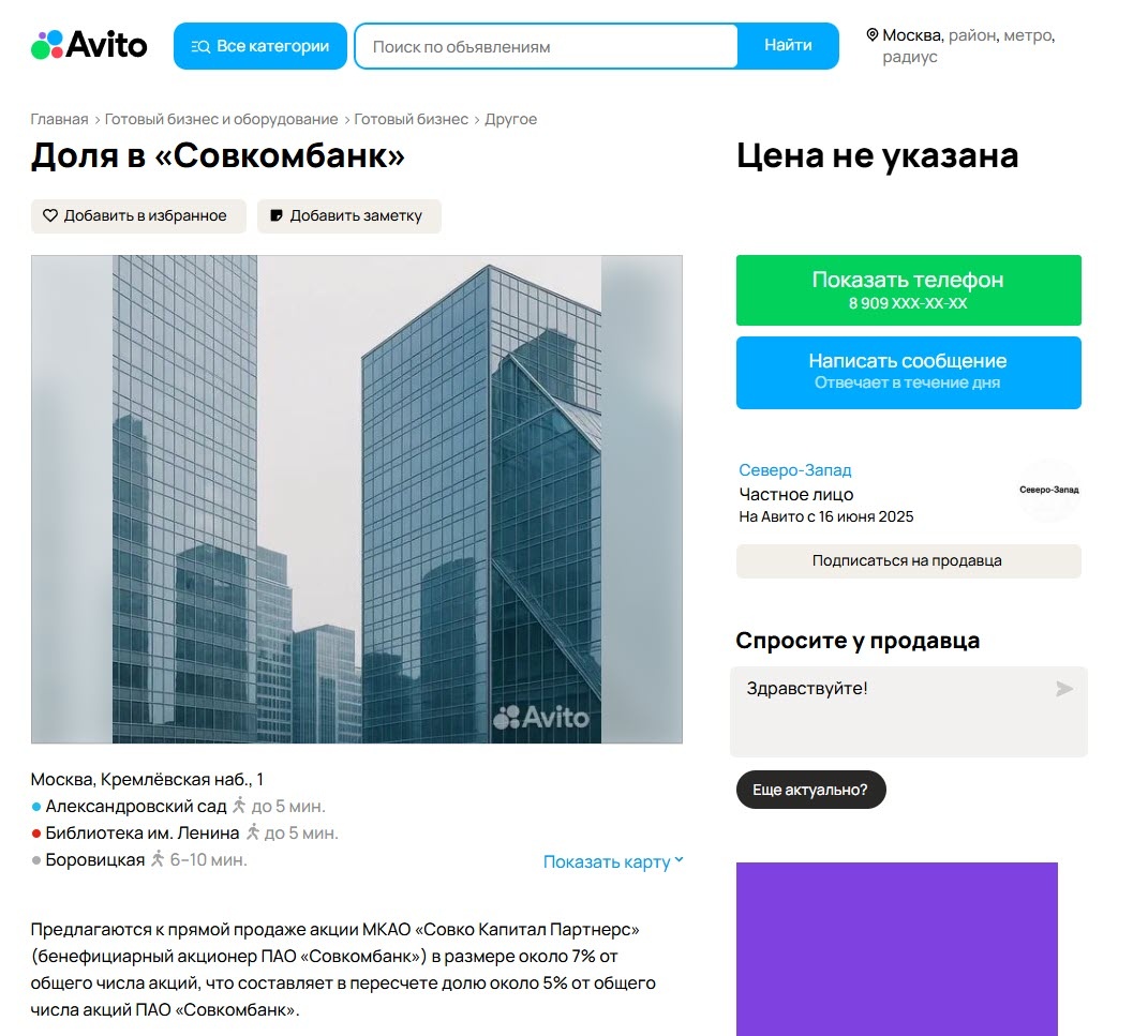 Крупный миноритарный акционер Совкомбанка Михаил Клюкин выбрал необычный способ продать свой пакет акций — он разместил объявление на площадке «Авито». Речь идет о пакете в 5%. На бирже сейчас такой пакет стоит чуть меньше 17 млрд рублей. Сообщается, что Клюкин самостоятельно ищет покупателя, рассчитывая продать акции выше рыночной цены. По словам представителя продавца, объявление разместили на «Авито», чтобы «привлечь как можно больший круг заинтересованных лиц». Аналогичное предложение направили текущим акционерам «Совкомбанка». Основная задача — продать весь пакет одному покупателю, так как «целый пакет имеет дополнительную стоимость». Окончательную стоимость определят в ходе переговоров. Отмечается, что для сделок с третьими лицами по акциям МКАО требуется одобрение совета директоров, а Совкомбанк входит в число системно значимых кредитных организаций России.