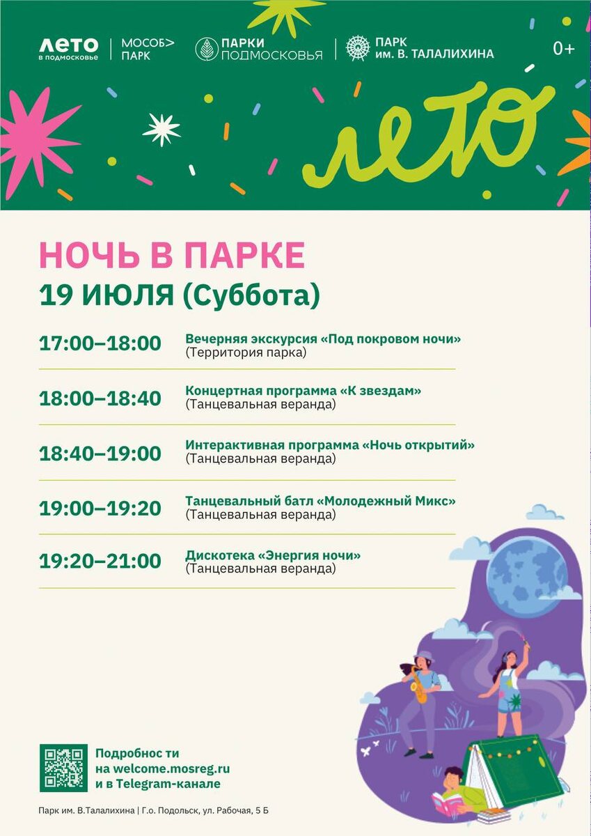 ✨ Праздничное мероприятие «Ночь в парке» 🚩19 июля с 17:00 до 21:00 вас ждёт: 🔻17:00-18:00 Вечерняя экскурсия «Под покровом ночи» (Территория парка) 🔻18:00-18:40 Концертная программа «К звездам» (Танцевальная веранда) 🔻18:40-19:00 Интерактивная программа «Ночь открытий» (Танцевальная веранда) 🔻19:00-19:20 Танцевальный батл «Молодежный Микс» (Танцевальная веранда) 🔻19:20-21:00 Дискотека «Энергия ночи» (Танцевальная веранда) 📆 19.07.2025 🕒 17:00 🏢 Парк культуры и отдыха им. В. Талалихина 📍 г. Подольск, ул. Рабочая, 5Б 💰 Вход свободный❗️ #webПодольск ⭐Разместить публикацию ⭐Поддержать канал голосом ✅ Мероприятия Подольск https://dzen.ru/id/66ed500f7b5671493eca3fd6 http://vk.com/podolsk_events http://dzen.ru/podolsk_events