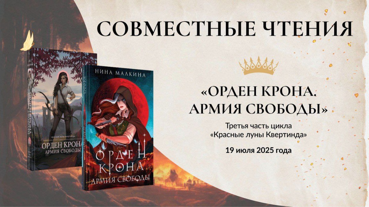 Утра! Читать "Войну и мир" и "Красные цепи" - это, конечно, весело! Но куда интереснее погрузиться в совместные чтения "Ордена Крона: Армии свободы" - третьей части цикла Нины Малкиной "Красные луны Квертинда" Я участвовала в СЧ по второй части, выиграла кружку и готова была написать целую диссертацию об этой книге. Теперь меня ждёт третья часть, которую, кстати, я люблю перечитывать больше всего! В общем, добро пожаловать в бессонные ночи! Рассказывайте, а вы участвуете в СЧ?)