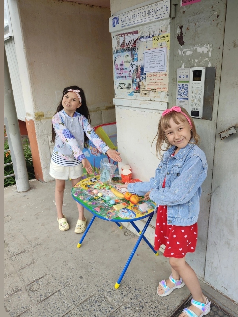И если мы в своём детстве расплачивались листиками сирени, то эти современные девочки берут плату деньгами. Настоящими. А как рады соседки бабушки поиграть с девчонками в магазин)