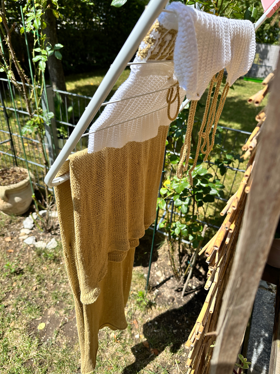 Привет дорогие Друзья! Не терпится поделиться готовой работой!!!! Конечно будет видео с фотографиями и обзором …. обычно я презентую готовые изделия на себе , думаю так интереснее зрителю представить как сидит модель на теле чтобы исчерпать как можно больше вдохновения на свои новые задумки … думаю вы меня поддерживаете в этом случае 😉❤️❤️ Я очень довольна результатом этой работы с нетерпением жду повода выгулять этот комплект 🤩 по ходу примерок у меня загорелась идея связать ещё один топ под эту юбку а именно из такой же пряжи тон в тон , будет тоже эффектно смотреться и к тому же добавится минимализм всему облику🤩🤩 в таком случае можно поиграть с украшениями и аксессуарами в золотых тонах… в общем тут лежит всё в наших руках наших вкусовых предпочтений и нашей фантазии!!! Пока комплект сушился я ходила и любовалась им , даже в таком положение на сушилке он мне очень нравится ,наблюдать как ветром с легка порхает юбку туда сюда😍 Да и вот такие казалось бы не не значимы