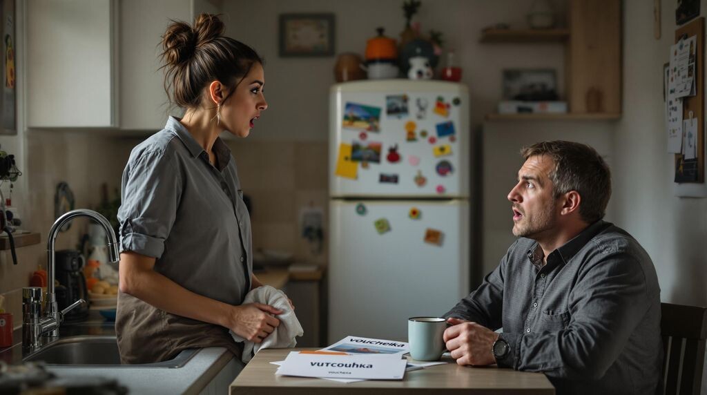 — А как надо понимать, Кость? Мы с тобой два года никуда не выезжали. Всё — ремонт, садик, твои "на работе не выплатили", моя подработка по ночам.