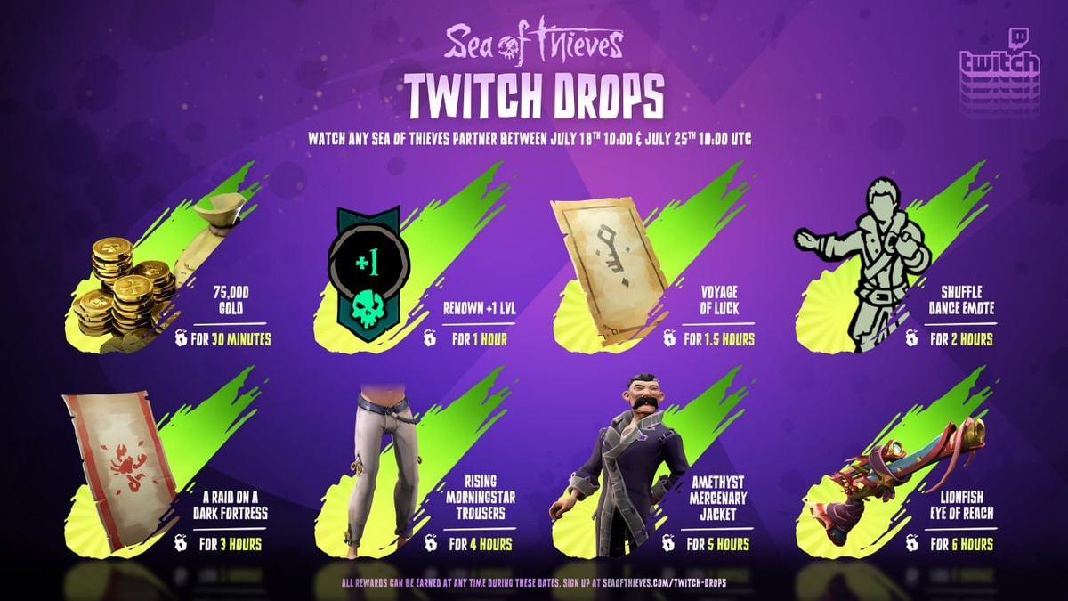 ⭐️ Доступна новая партия Twitch Drops, включая очень стильный камзол! Настройтесь на любой партнёрский стрим Sea of Thieves, чтобы получить все предметы, указанные на изображении выше, с 18 по 25 июля ( с 13:00 по МСК).