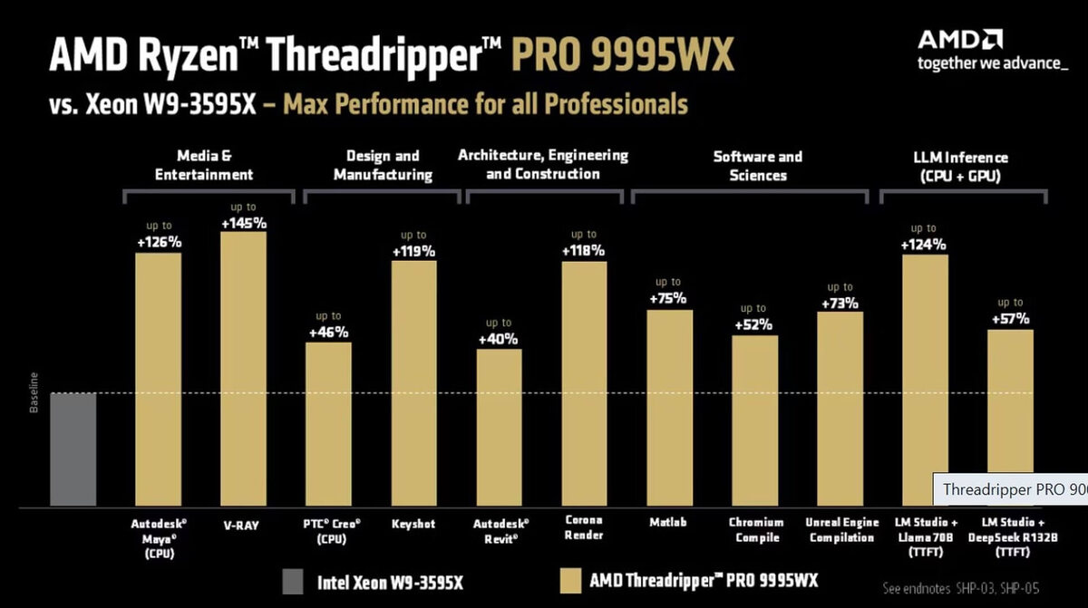 Первоначально процессоры Ryzen Threadripper 9000 и 9000 WX-серии (кодовое название Shimada Peak) были анонсированы на выставке Computex 2025. Сегодня AMD раскрыла цены и даты выпуска новинок. Напомним, что главное улучшение процессоров Ryzen Threadripper 9000 серии WX заключается в их архитектуре. Чипы Shimada Peak используют новейшие ядра AMD Zen 5, обеспечивающие заметное повышение показателя IPC (количество инструкций за такт) по сравнению с ядрами Zen 4, применяемыми в процессорах Ryzen Threadripper 7000 серии WX (кодовое название Storm Peak). Базовая тактовая частота Shimada Peak идентична Storm Peak. Однако AMD увеличила её до 5,4 ГГц, что даёт прирост от 100 до 300 МГц в зависимости от модели. Конфигурация кэш-памяти L3 осталась прежней: 64 МБ для 16-ядерных моделей, 128 МБ для 24- и 32-ядерных, 256 МБ для 64-ядерных и 384 МБ для 96-ядерных процессоров. Тепловой пакет (TDP) также не изменился: все процессоры Shimada Peak имеют максимальное значение 350 Вт. AMD заявляет об увелич