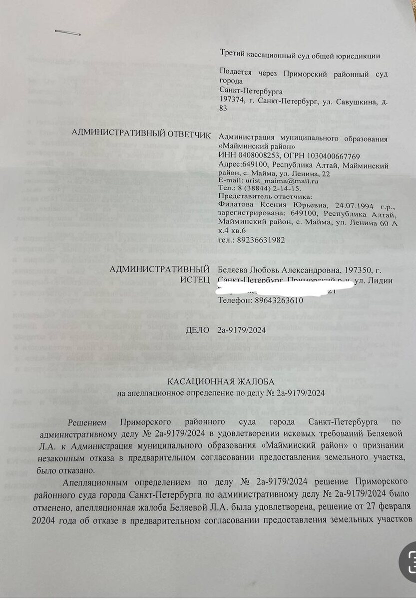 Судимся дальше с Администрацией Майминского района р.Алтай за участки в Манжерокском СП. Администрация не сдается, если помните, я рассказывала, что отказ администрации в предварительном согласовании земельного участка был основан на том, что участок находится в водоохранной зоне. Первая инстанция почему-то посчитала отказ законным ( а мы ведь все помним, что в водоохранной зоне строить жилой дом можно👆 тем более я подавала заявление на ВРИ «ЛПХ на приусадебных», который не предусматривает обязательное строительство капитального строения). В апелляции с решением суда не согласились. Но администрация опять настаивает на своем. И вот теперь будем судится в кассации. Причем в суды администрация присылает возражения с новыми причинами, которых не было в первоначальном отказе. На которые я конечно же даю свои отзывы. В которых, в том числе, призываю суд не учитывать те обстоятельства, которые не были указаны в Решении об отказе. Посмотрим, возьмет ли верх правосудие. Какие ваши ставки