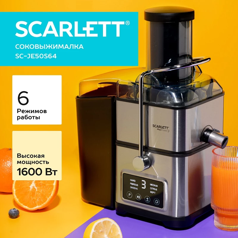 Scarlett SC-JE50S64 — это техника высокой мощности, 1600 Вт, с 6 предустановленными режимами работы. В модели предусмотрена широкая загрузочная горловина, диаметром 75 мм. Для сохранения чистоты столешницы во время отжима есть функция Капля-стоп.