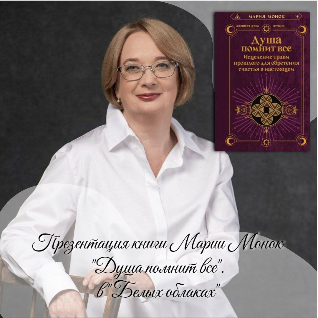 Друзья, с огромным интересом читаю книгу Марии Монок "Душа помнит все" - известного российского регрессолога. Это долгожданная книга для многих. У Марии огромный опыт и тысячи учеников (и я к ним отношусь). Книга легко читается, в ней много практических примеров, разбор историй клиентов. В эту субботу - 19.07 в 17.00 в "Белых облаках" будет презентация этой книги!!! На презентации Мария расскажет о том: -Как проработка негативных проявлений прошлых жизней помогает избавиться от старых травм и обид, -Найти предназначение и построить счастливое настоящее. -Особое внимание будет уделено тесной связи с Высшим Я: залогом гармонии с собой и улучшений в каждой сфере жизни. Беседка Белых Облаков Вход Свободный https://white-clouds.ru/events/dusha-pomnit-vsye-istselenie-travm-proshlogo-dlya-obreteniya-schastya-nastoyashchem/