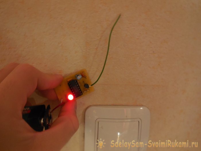 Довольно часто у жителей многоквартирных домов возникает необходимость закрепить на стене квартиры картину, вешалку, полку или ещё какой-нибудь предмет интерьера. Для этого необходимо отметить точку на стене и пробурить небольшое отверстие перфоратором. Однако всегда есть вероятность попасть в проводку, спрятанную в стене под обоями – в этом случае небольшое обновление интерьера может закончится неизбежным вызовом электриков. Чтобы такого не произошло, можно собрать простой детектор скрытой проводки, который точно покажет, где проходят провода, а где их нет. Чувствительным элементом схемы является полевой транзистор КП103, к затвору которого подключается антенна. Можно применять транзистор в любом корпусе и с любым буквенным индексом. Прибор реагирует на провода под напряжением 220 В 50 Гц независимо от того, течёт по ним ток, или нет. Также в схеме используется микросхема К561ЛА7, которая представляет собой 4 логических элемента 2И-НЕ. Её можно заменить импортным аналогом, микросхемой