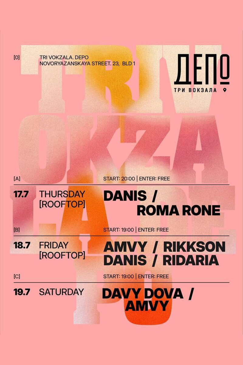 Найдено место для летних вечеринок под открытым небом! Делимся, где можно танцевать под диджей-сеты, встречая закат. В «Три вокзала. Депо» (та самая локация на Новорязанской) каждые четверг, пятницу и субботу проходят open-air вечеринки 🪩 Сразу две локации: 🌆На крыше — вау-закаты с панорамным видом на город 💫В уютном внутреннем дворе — камерная атмосфера на «Станции Счастья» В эти выходные за пультом будут Amvy, Rikkson, Danis (Morning Coffee Club), Ridaria и Davy Dova — каждый со своим стилем, энергией и историей. От андерграундных кофейных рейвов до афрохауса и треков, одобренных Solomun. Следите за анонсами! 📅 четверг — суббота, 19:00- 23:00 🎟 вход свободный 📍Три Вокзала.Депо, Новорязанская ул., 23с1 (Тераса на крыше / Двор)