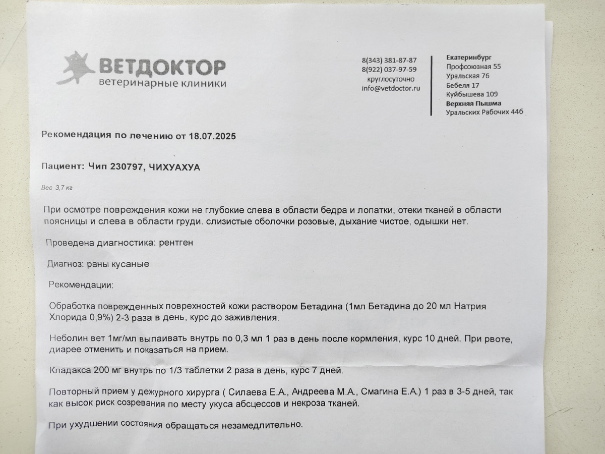 Когда заводишь собаку, то внутренне готовишься к тратам на уход, профилактику, лечение и воспитание, но есть вещи, к которым подготовиться невозможно ‒ неадекватные хозяева других собак. Моя собака взрослая, но судьба у него непростая, из-за чего есть проблемы в воспитании ‒ обожает людей и кошек, а вот к сородичам может быть предупредительно агрессивен (приходилось защищаться от нападений). Из-за этого я его спускаю с поводка лишь в местах, где минимизирован риск встречи с другими псами. Но тут я скорее берегу его ‒ пёсель весом 3,7 кг вряд ли нанасет большой урон, а вот ответочку может схлопотать нехилую. Вчера на Чипа набросилась собака. ВО ДВОРЕ. Не очень большая, но достаточно крепкая, тяжелее моего раза в три, а то и в четыре. Без предупреждения, молча, сзади. Мой был в шлейке и на поводке, и зубы собаки пришлись как раз на шлеечные защелки. Секундная заминка позволила выдернуть собаку на руки, но агрессивная бестия еще некоторое время пыталась его оттуда достать. Хозяйки рядом