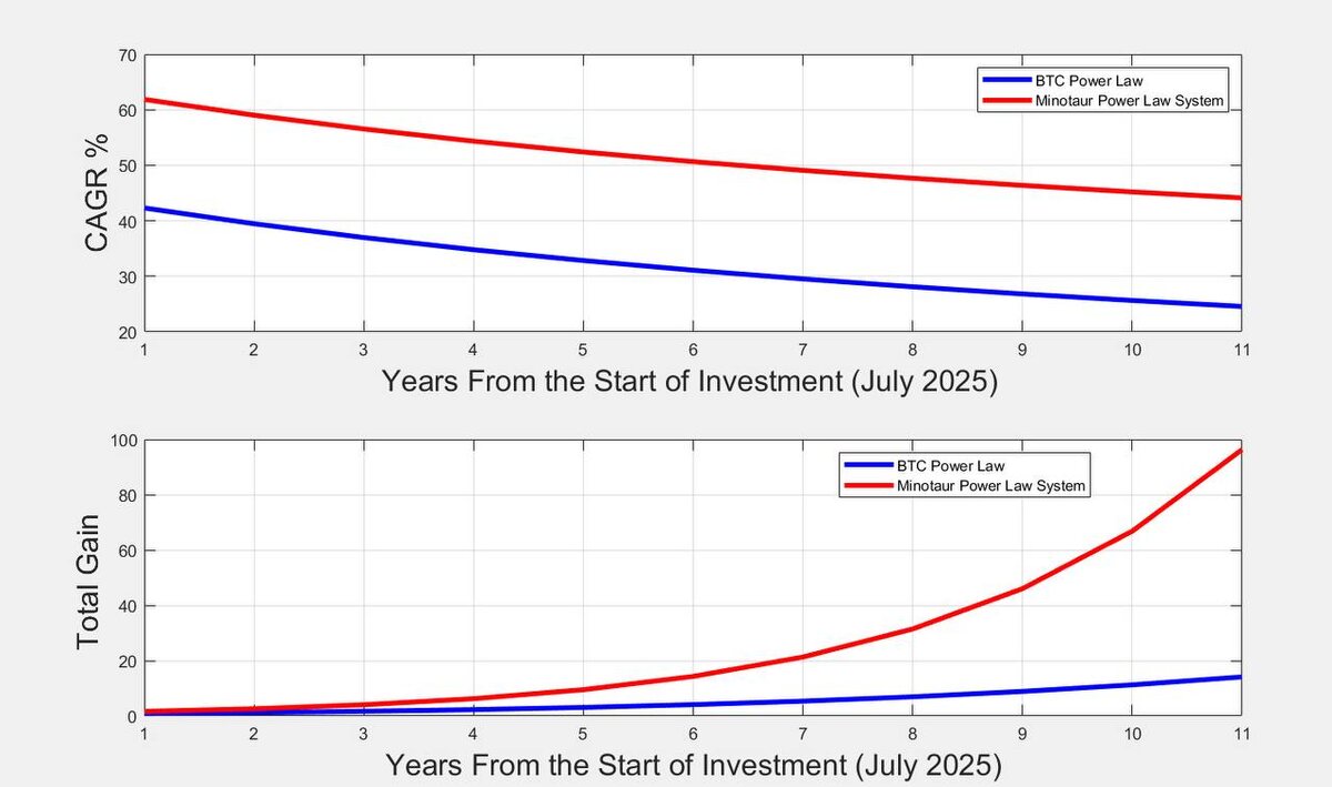 — Синяя линия: просто держим BTC, полагаясь на его логарифмический рост (Power Law).