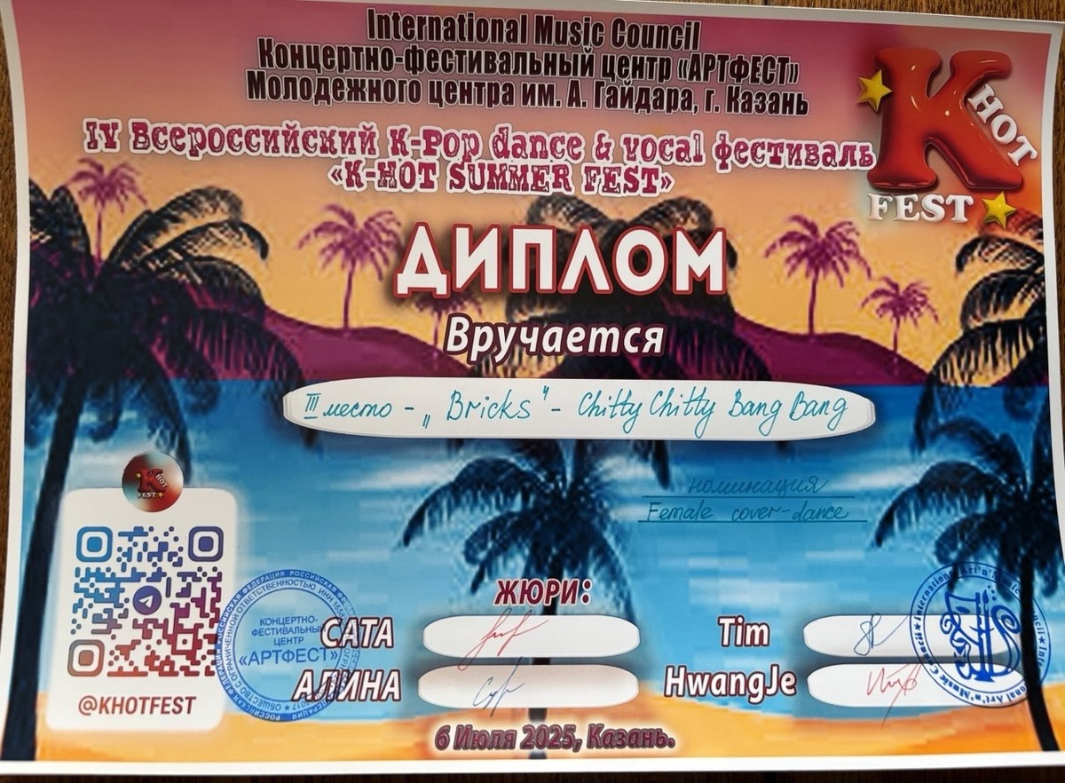 В Казани прошел Всероссийский конкурс-фестиваль K-POP "K-HOT SUMMER FEST", где танцевальная группа "Bricks" подросткового клуба "Атлант" заняла третье место среди 80 участников. Фестиваль собрал K-POP исполнителей со всей России в молодежном центре им. А. Гайдара, создав атмосферу поддержки и обмена опытом.