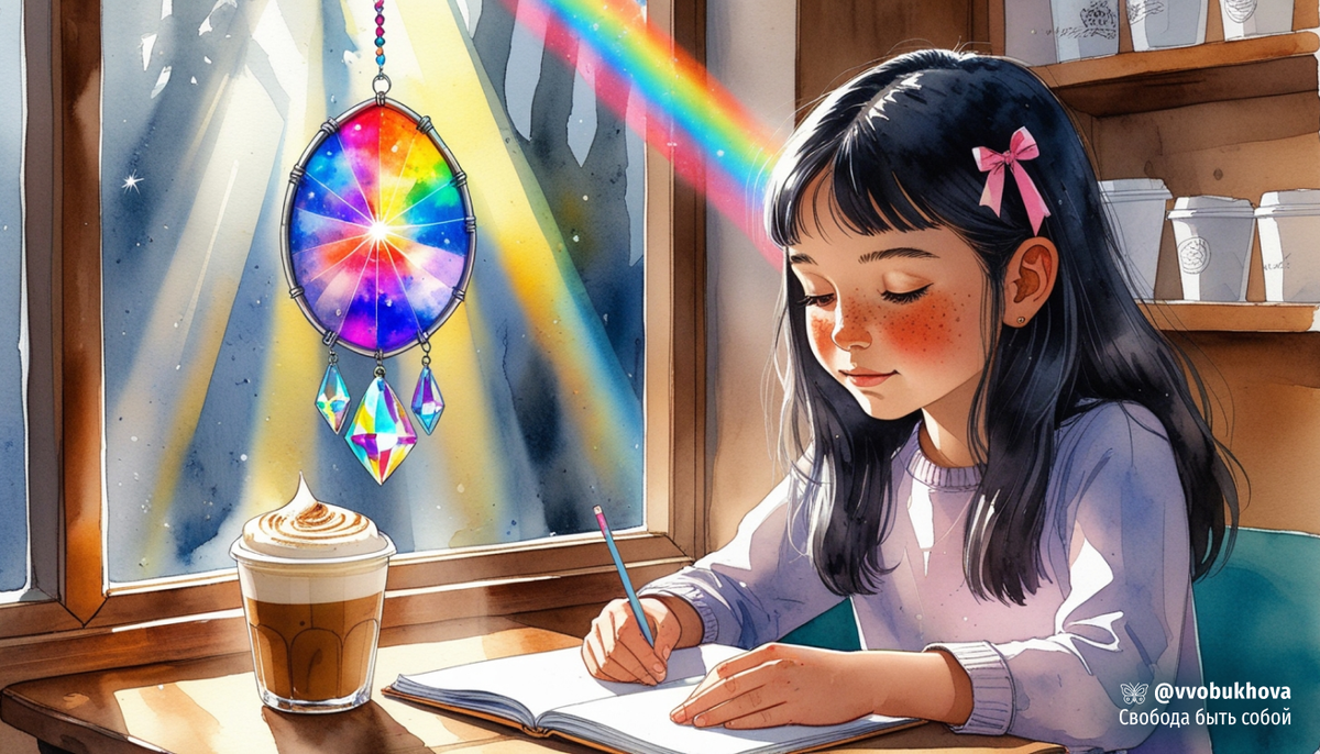 Бризвиль, кофейня на Утёсной, 18 июля Тётя Эля сегодня превратила свою мастерскую в «зону творческого урагана»: дверь закрыта, из-под неё торчат разноцветные нитки, а на табличке написано: «Вход только для муз и очень храбрых». Я осталась одна в тихом доме, предоставленная сама себе. И решила не рисковать, а отправиться в город на поиски маленького, спонтанного приключения. Бродила по уже знакомым улочкам, когда, проходя мимо одной из скамеек, услышала, как одна старушка говорит другой: «...а потом мы пошли в ту самую кофейню на Утёсной, где подают радугу в чашке». Моё сердце ёкнуло — вот оно, моё сегодняшнее приключение! Кофейня пряталась за кружевной тенью старых акаций. У неё была небольшая терраса с видом на море. Там сидели шумные компании туристов. Мне же сегодня хотелось тишины. Я же пришла сюда не за морем, как они. А за радугой. И я, не раздумывая, прошла вглубь кофейни, в её уютное, полутёмное сердце. Когда я открыла дверь, меня оглушил тихий хрустальный звон — это задетые мн