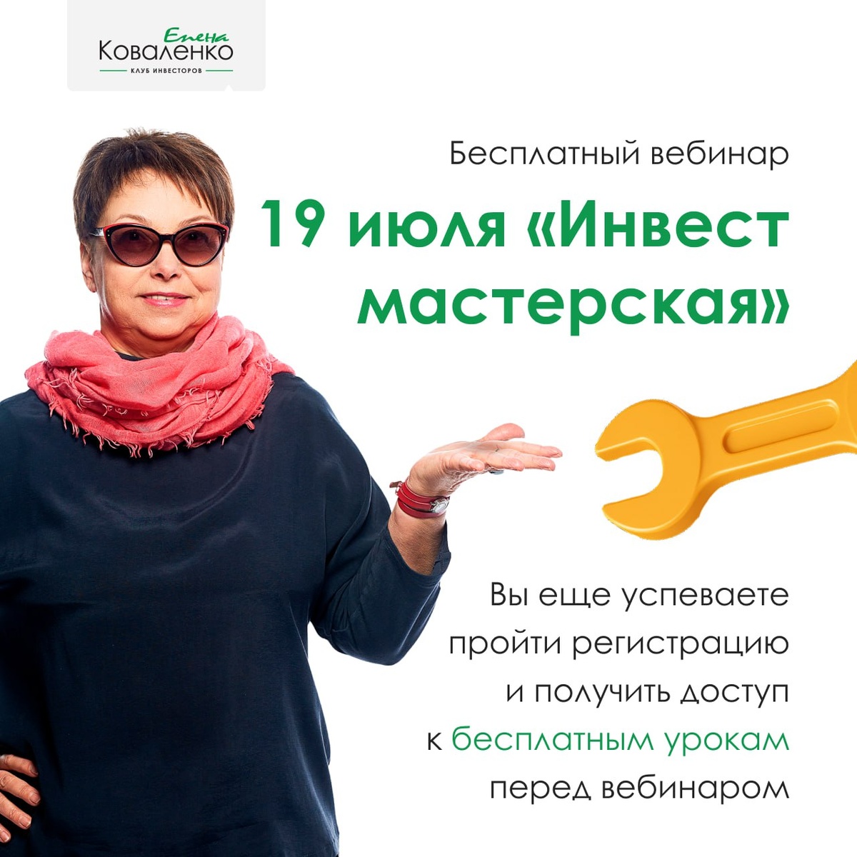 Вы еще успеваете занять место в инвест-мастерской [завтра бесплатный вебинар] Мы выходим на финишную прямую - уже завтра встречаемся на вебинаре «Инвест-мастерская с Еленой Коваленко» 19 июля (суббота) в 12:00 мск жду Вас в прямом эфире. Регистрация тут: https://elena-kovalenko.finprogress.ru/master ☝️☝️ сразу после регистрации вы получите подарки: 🎁 Чек-лист «10 Критериев отбора облигаций» 🎁 Видео-книга «Капитал с нулями»