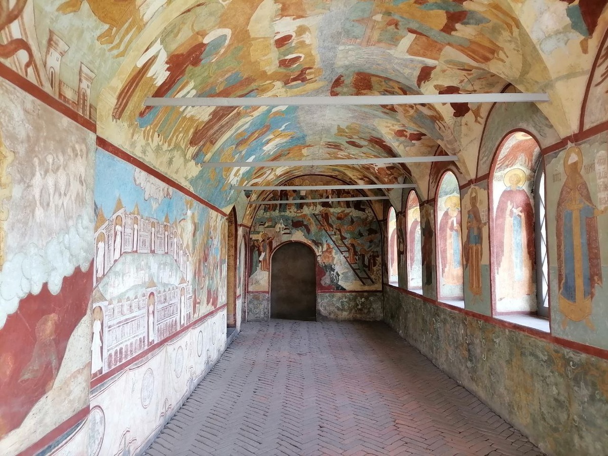 Переходы - популярная у туристов особенность Ростовского кремля. Они часто ассоциируются с фильмом Иван Васильевич меняет профессию. Вход на переходы платный. Билет стоит 400 рублей (льготный стоит 200 рублей). Прогулка по переходам входит в стоимость единого билета. Что ещё входит в стоимость единого билета: Чтобы попасть на переходы надо войти в Воскресенскую церковь (дверь слева). Подняться по лестнице. Переходы соединяют надвратные церкви. В храме старинные фрески, мне нравится их рассматривать. Я четвёртый раз посещаю церковь. В четвёртый раз внимательно рассматриваю фрески. Храм недействующий, поэтому нет ограничений на фотосъёмку. Мне нравится сочетание тонов, очень красиво. Храм состоит из галерей и основного помещения. Мне очень нравятся галерии и фрески. Я обожаю рассматривать фрески. Храм мне очень нравится. Из церкви выход на переходы. Похожи на боевой ход, но Ростовский кремль - резиденция архиереев, а не крепость. Переходы служат смотровой площадкой.