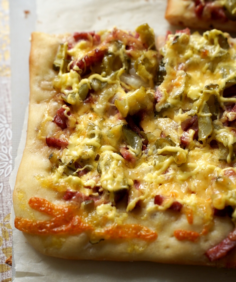 - Выложите колбасу, лук, помидоры. Не бойтесь класть много!