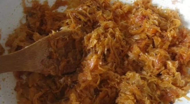 Капуста квашеная - 1 кг, Соль - 1 ч. л., Сахар - 1 ч. л., Лук репчатый - 2-3 шт., Жир - 100 г или растительное масло - 100 г, Томатная паста - 1 ст. л., Тмин - 0,5 ч. л.