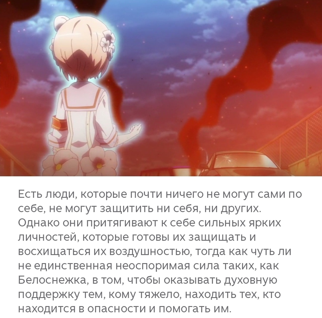 Однако, Алиса, кажется, готова быть еще более преданной защитницей Белоснежки, чем Дева. И это тоже интересная интерпретация образа рыцарских персонажей в подобных тайтлах. Во многом это связано с тем, что в реальной жизни они оказалась не нужна родителям, и долгое время оставалась без участия взрослых. В жизни таких людей спонтанное и искреннее проявление доброты и заботы может иметь далеко идущие последствия.