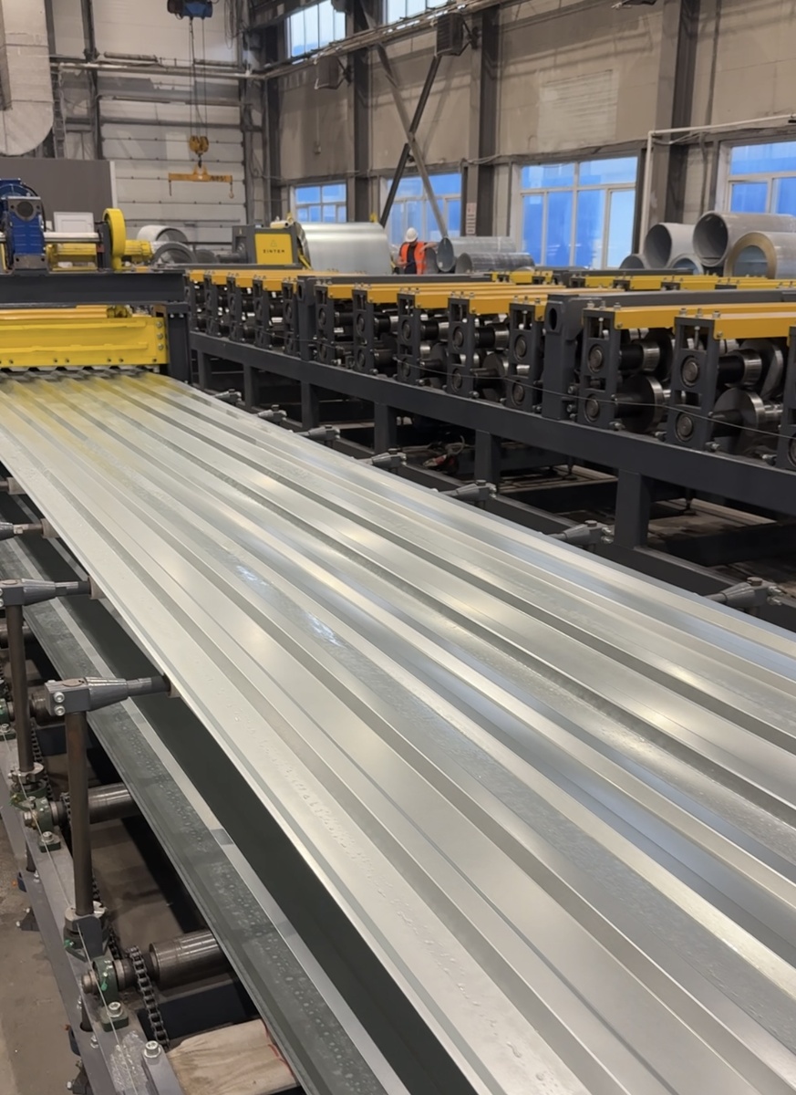Лист со скоростью 20-40 м/мин проходит через прокатные клети, где ему придается волнообразная, трапециевидная или иная форма.