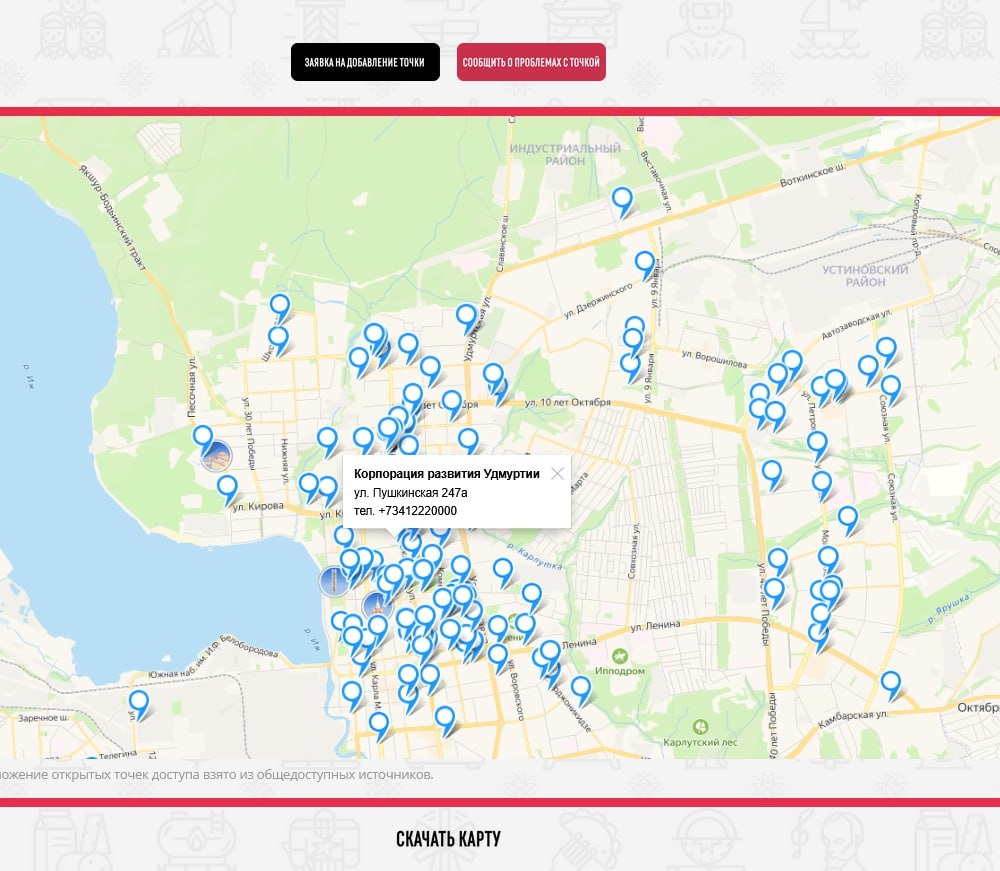 В Ижевске подготовили карту точек доступа к Wi-Fi Интерактивная карта опубликована на сайте Корпорации развития Удмуртии. Ее также можно скачать на свой гаджет. Кроме того, жители Ижевска сами могут предложить организовать точку доступа к интернету через Wi-Fi. Напомним, в Удмуртии действует ограничение мобильного интернета. Это связано с угрозой атаки беспилотников. В начале июля Глава республики Александр Бречалов заявил, что ограничения пока отменять не планируется. Подписывайся на Ижевский бизON #Ижевск