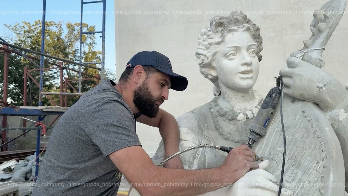 Петербургские скульпторы восстанавливают фигуры на фасаде Русского драматического театра Мариуполя