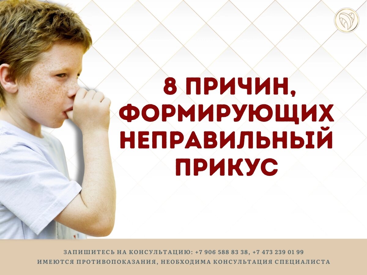 На самом деле, причина не всегда в генетике. 👉 В некоторых случаях виноваты… повседневные привычки и хронические паттерны. Невинные, привычные, даже незаметные, но именно они медленно и незаметно деформируют прикус. 🦷 Вот 8 причин, которые влияют на прикус у детей и взрослых: Часто начинается из-за аденоидов или аллергии. Язык опускается вниз, верхняя челюсть сужается, формируется V-образный прикус. Хронический паттерн дыхания через рот приводит к смещению челюсти и напряжению мышц лица и шеи. Формирует открытый прикус, влияет на рост челюстей. Переходит в привычку грызть ручки, ногти, щёки, а результат: микротравмы и неравномерная нагрузка на зубы. Язык упирается в зубы, а не в небо - это мешает росту челюстей и вызывает открытый прикус. Сохраняется мышечный дисбаланс, перегрузка суставов, ускоренная стираемость зубов. Может проявляться при стрессах. Повреждает эмаль и прикус. Вызывает сильное стирание зубов, напряжение челюстей и работу сустава "на износ".