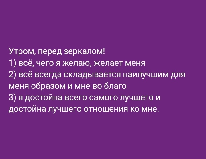 Каждый день повторять аффирмации: 3 фразы повторять в течении 3 дней: Утром, перед зеркалом! 1) всё, чего я желаю, желает меня 2) всё всегда складывается наилучшим для меня образом и мне во благо 3) я достойна всего самого лучшего и достойна лучшего отношения ко мне. Пробуйте и вы!