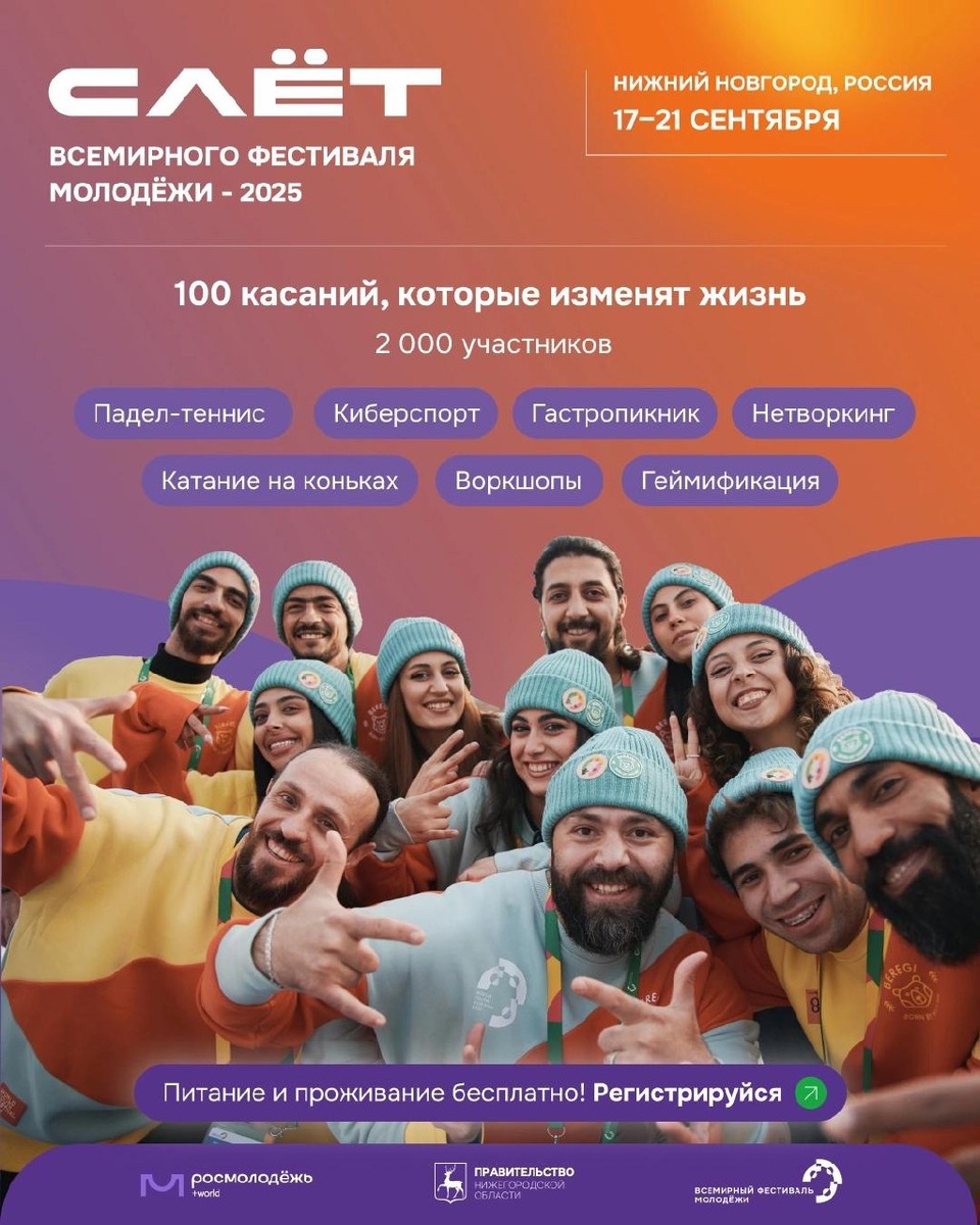 ⚡️В период с 17 по 21 сентября 2025 года в г. Нижнем Новгороде запланировано проведение Слета Всемирного фестиваля молодежи – 2025 🎉Участников ждут образовательные, культурные, спортивные и проектные активности, тренд-баттлы, киберспорт, мастер-классы и другие мероприятия. 😎Слет пройдет в формате интерактивной модульной площадки для новых совместных решений реальных вызовов, стоящих в современном мире, и смелых инициатив молодёжи со всего мира. 🌐Регистрация продлится на сайте до 20 июля 🌐 Подпишись на канал | Предложить новость 🌐 Вконтакте | 🌐 Одноклаcсники @luganmedia