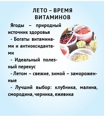 Лето - время заправиться витаминами Ягоды - источник витаминов, антиоксидантов, удобный вариант для перекуса. Летом лучше отдавать предпочтение свежим сезонным, а зимой выручит заморозка.