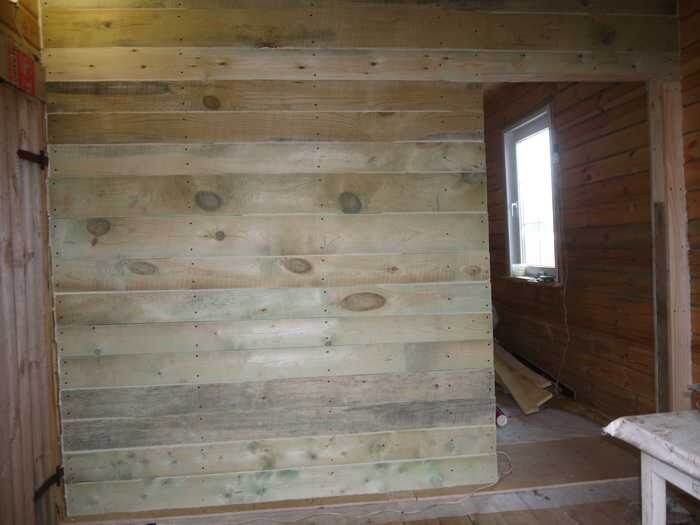 Вторую сторону также закрываем досками. На этом монтаж межкомнатной перегородки закончен. В дальнейшем на одну сторону планируется прикрепить ламинат, а на вторую наклеить гипсовую плитку.